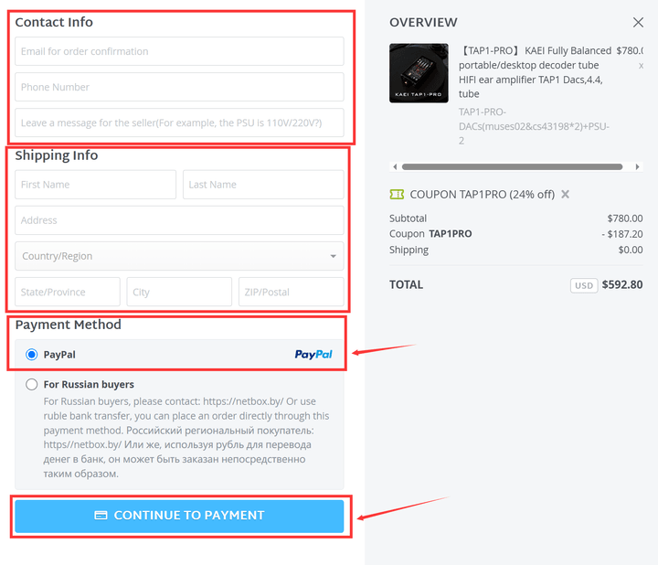 受取先情報と連絡先情報を入力後、支払い手続きを完了ください。手続き終了後、貨物を速やかに発送いたします。